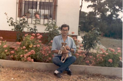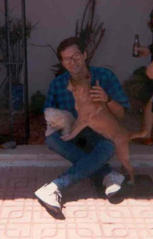 Aquí estoy yo con Coco y Chela. El Coco era el perro de Leli, por aquel entonces mi novia, es ese "peluche" blanco, el pobre murió muy jovencito, era una monería de perro. La Chela fué la perra de casa de siempre, vivió de 16 o 17 años, tenía un caracter terrible para la gente de no era de la familia, estaba como una regadera. Con mi madre tenía pasión ( y mi madre con ella también).