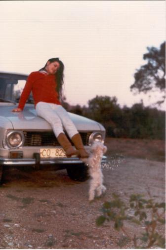 Coco con su dueña, subida sobre su coche "Facundo", un Renault 6.