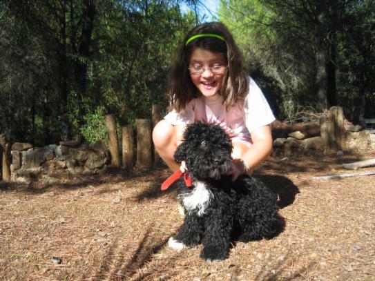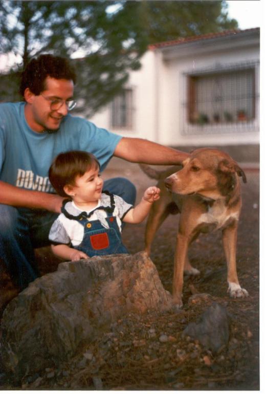 Con Araceli, muy pequeñita, y Rufo(qepd), ¡¡¡ que buen perro era !!!, muy noble y cariñoso, nunca lo olvidaremos, supo ganarse un parte importante en nuestros corazones. Estabamos partiendo piñones, y Araceli empeñada en que Rufo se comiera uno.